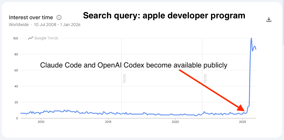 In the podcast, I dig into something I found while preparing to record. Searches for “Apple developer program” on Google Trends spiked 20x in June 2025, right after OpenAI and Anthropic released their coding agents. What happened? Non-coders suddenly realised they could build things.