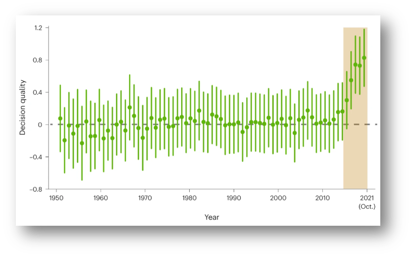 Researchers from City University of Hong Kong, Yale and Princeton analysed 5.8 million moves from professional Go games played between 1950 and 2021. They tracked decision quality year by year, using AI to evaluate each move.